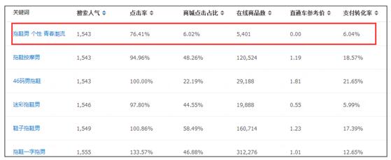 大家看第一个关键词:拖鞋男 个性 青春潮流,这个现在的搜索人气只有1500多,但是大促的时候,搜索人气肯定比这个高。而我们看这个关键词的在线商品数:5400多(相比较,动辄几百上千万,这个几千是不是可以忽略不计);商城点击占比:6.02%,淘宝卖家机会多多的;支付转化率:6.04%,对于男鞋类目来说,这个转化很不错了;最关键的是你看直通车参考价:0元,说明什么,说明这个词几乎没有竞争、没有关注啊。那么,你如果在大促前,把这个词稍稍优化一下,大促当天,你的排名会不会很优秀?